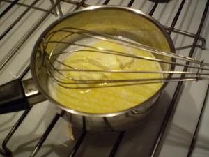 Vispa ägg och socker pösigt och tillsätt sedan det kokande vattnet. Blanda sedan i mjölet hopblandat med bakpulvret. Grädda i smord och bröad form längst ner i ugnen på 175 grader i ungefär fyrtio minuter eller tills den känns färdig (prova med en sticka).