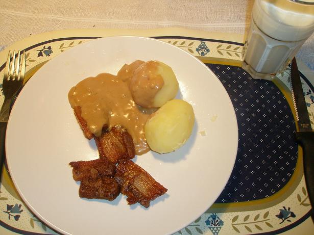 För fyra hungriga personer behövs en rejäl bit rimmat sidfläsk på ungefär ett halvkilo – eller motsvarande mängd skivat. Knaperstek och låt rinna av på hushållspapper. Såsen lagar du så här: