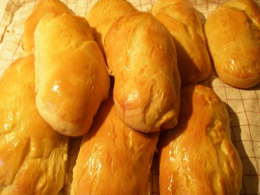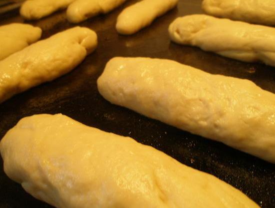 När degen jäst till dubbel storlek välter du ut den på bakbordet igen. Skär såpass stora bitar att de får plats i handen och rulla sedan ut dem till avlånga rullar – ungefär 12 cm långa och 5 cm i diameter. Låt dem jäsa till dubbel storlek på smord plåt och värm under tiden ugnen till 200 grader.
