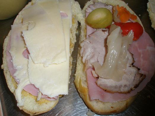 Dela bröden och bred ett tunt lager senap på både över- och undersidan. Lägg skinka, fläskkött, pickles, ost och skinka igen på underskorpan och täck med överskorpan. Lägg ihop brödhalvorna och grilla dem sedan en liten stund i våffeljärn eller smörgåsgrill. Passar utmärkt till en kall öl, mineralvatten eller varför inte en kopp te. Det är också gott att skära de färdiggrillade mackorna i mindre bitar och servera som snacks till en drink.