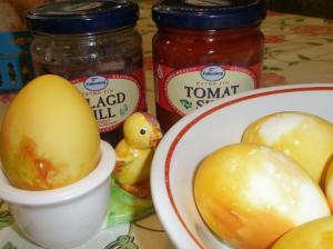 Man kan förstås använda annat än lök. Blåbär ger vackert blåskimrande ägg, och rödbetor lite brunröda. Prova dig fram och njut av en härlig äggfrukost i påsk!