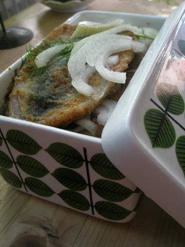 Varva de stekta strömmingarna med skivad lök och dillkvistar i en fin form som de kan serveras ur. Häll över lagen medan strömmingarna fortfarande är varma. Förvara i kyl till nästa dag.
