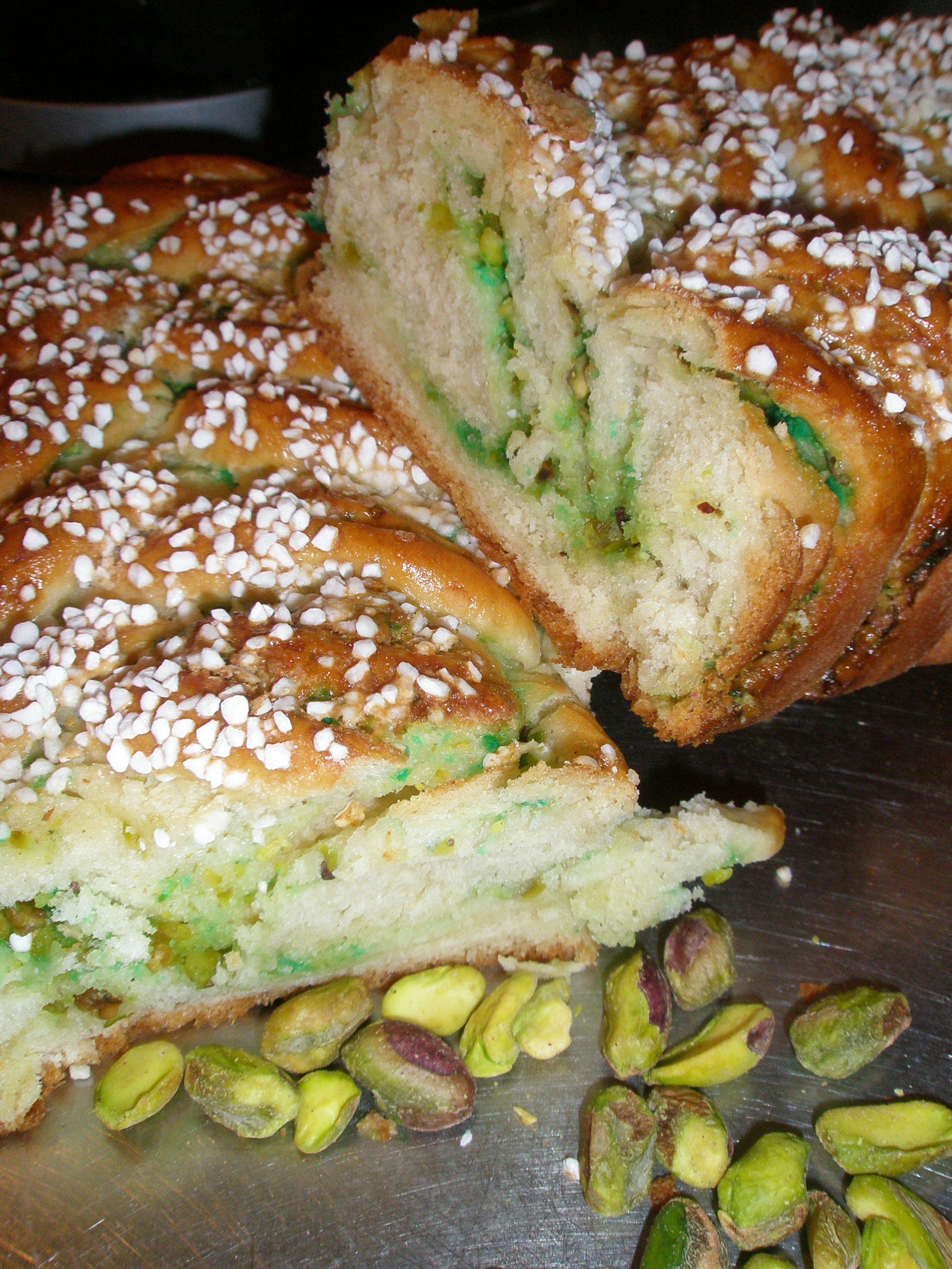 Varför inte baka några goda vetelängder med pistagefyllning? Pistagemandel ger en underbar smak i vetebröd. Passar att frysa in – eller avnjutas ljumma och nygräddade för den delen…