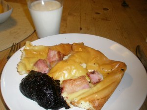 Skär ca 300 g rimmat sidfläsk i tärningar och lägg ut på en smord plåt med ganska höga kanter. Häll över pannkakssmeten och sätt in i mitten av ugnen på ca 180-200 grader. Grädda tills pannkakan fått fin färg och servera med lingon eller annan valfri sylt (jag älskar blåbärssylt till!), eventuellt en god råkostsallad med morot och vitkål och ett glas kall mjölk.