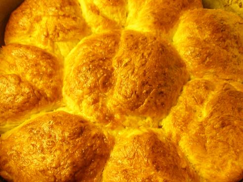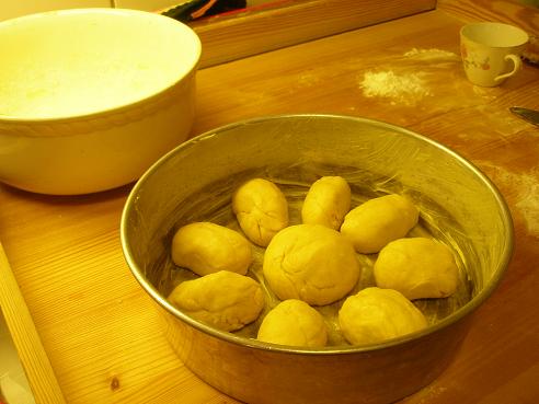 Dela degen i nio delar. Forma en av bitarna till en rund bulle och gör de andra mer ovala till formen. Smörj en stor rund kakform (ca 2 l) och lägg i bullarna – den runda i mitten. Om du har en kakform med löstagbar kant kan du lägga bullarna på en smord plåt istället och placera ringen från kakformen runt om så att kakan behåller sin fina form.