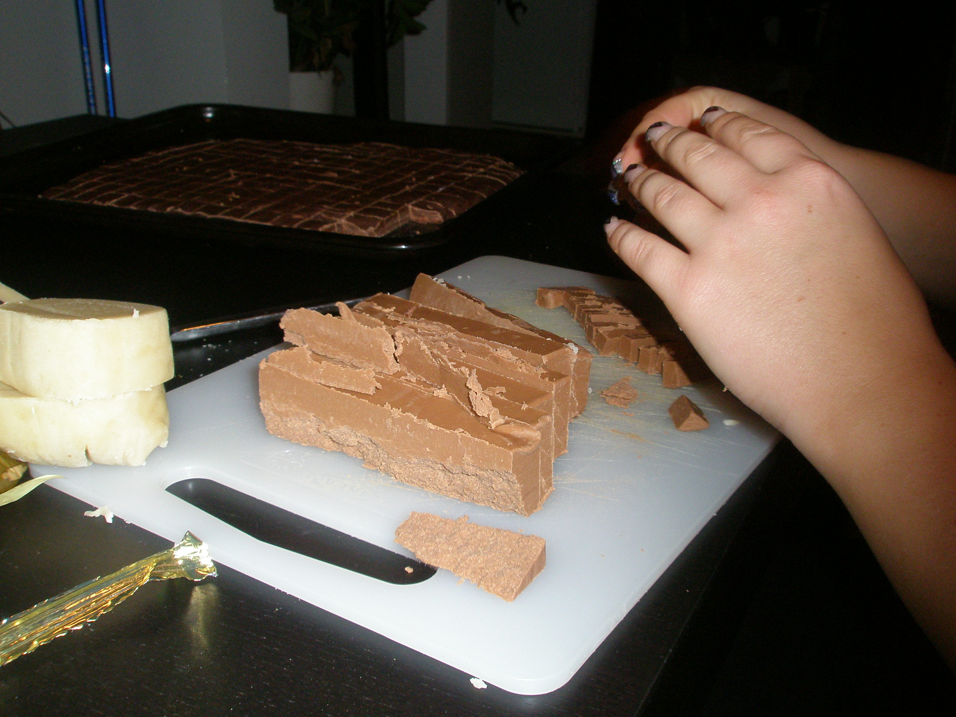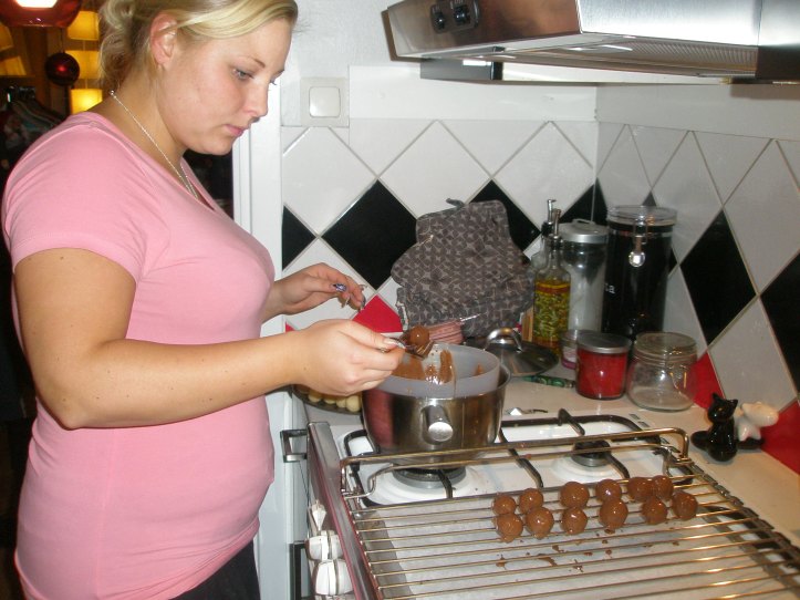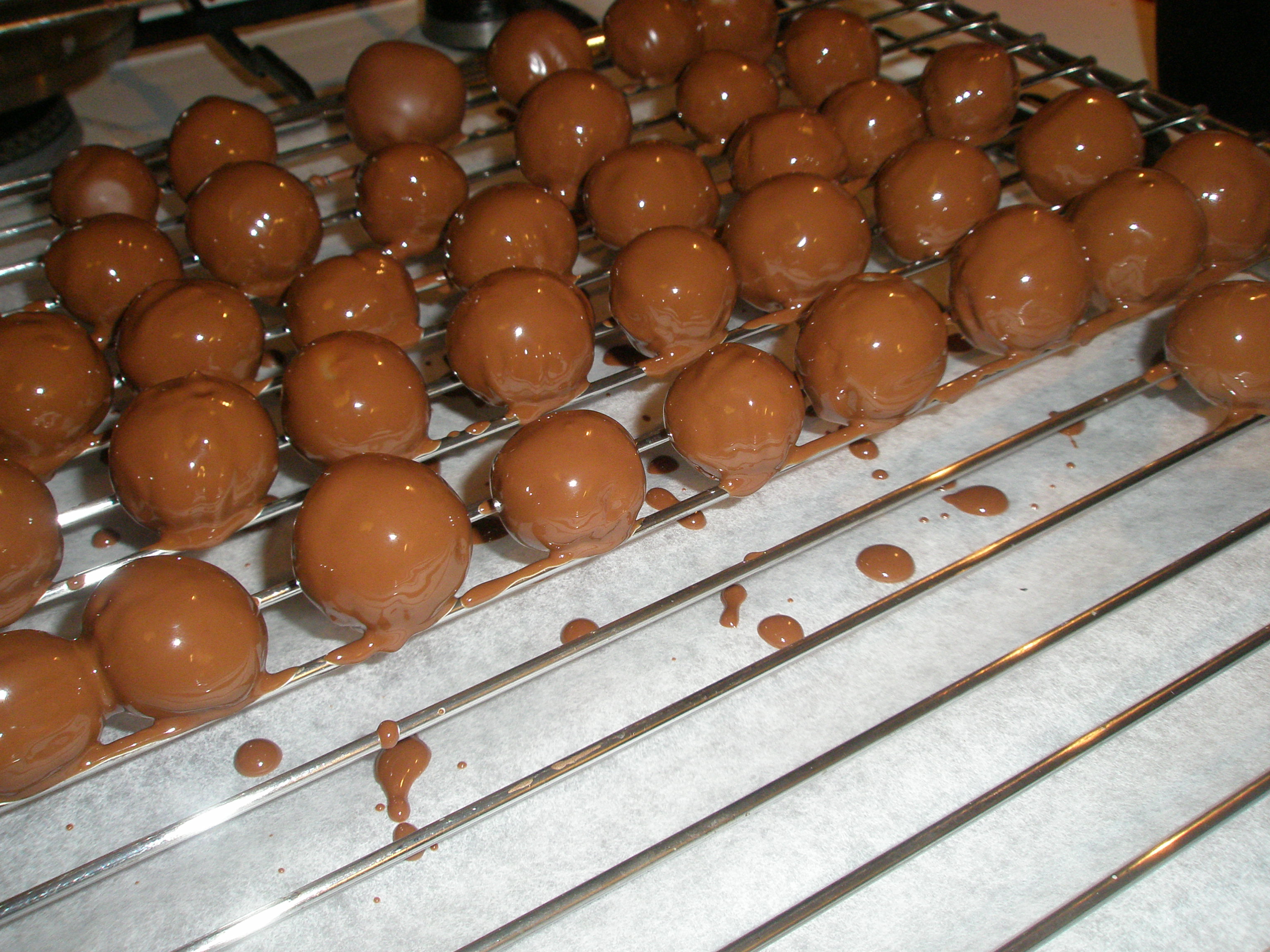 Nougaten ska liksom ”bakas in” i mandelmassan, sedan ska kulan rullas till en fin kula. Smält blockchokladen i vattenbad och lägg i några kulor åt gången. Ta upp dem med gaffel och låt stelna på bakgaller. Underbart gott!