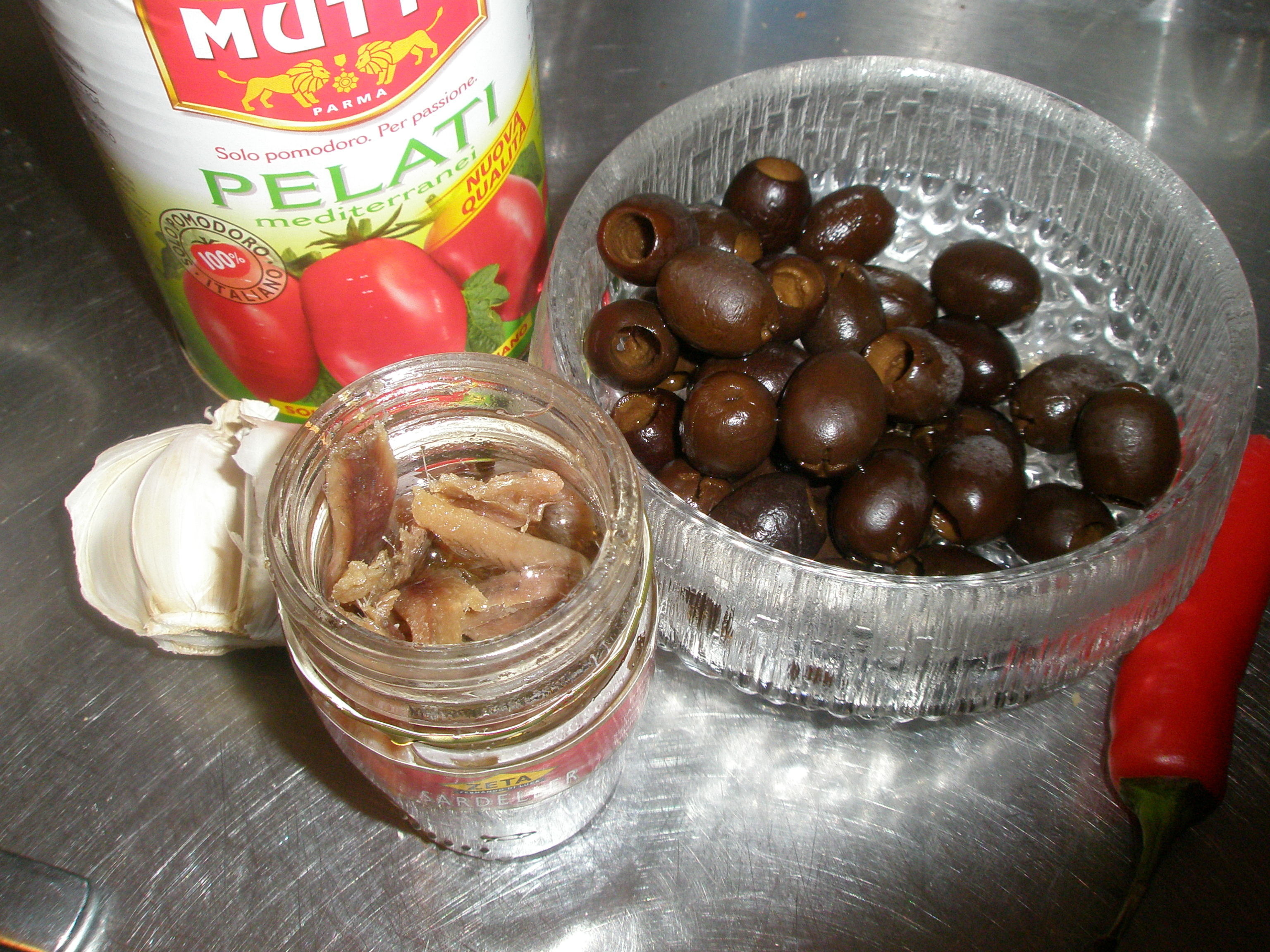 Oliver, sardeller, vitlök och tomat blir härlig pastasås!