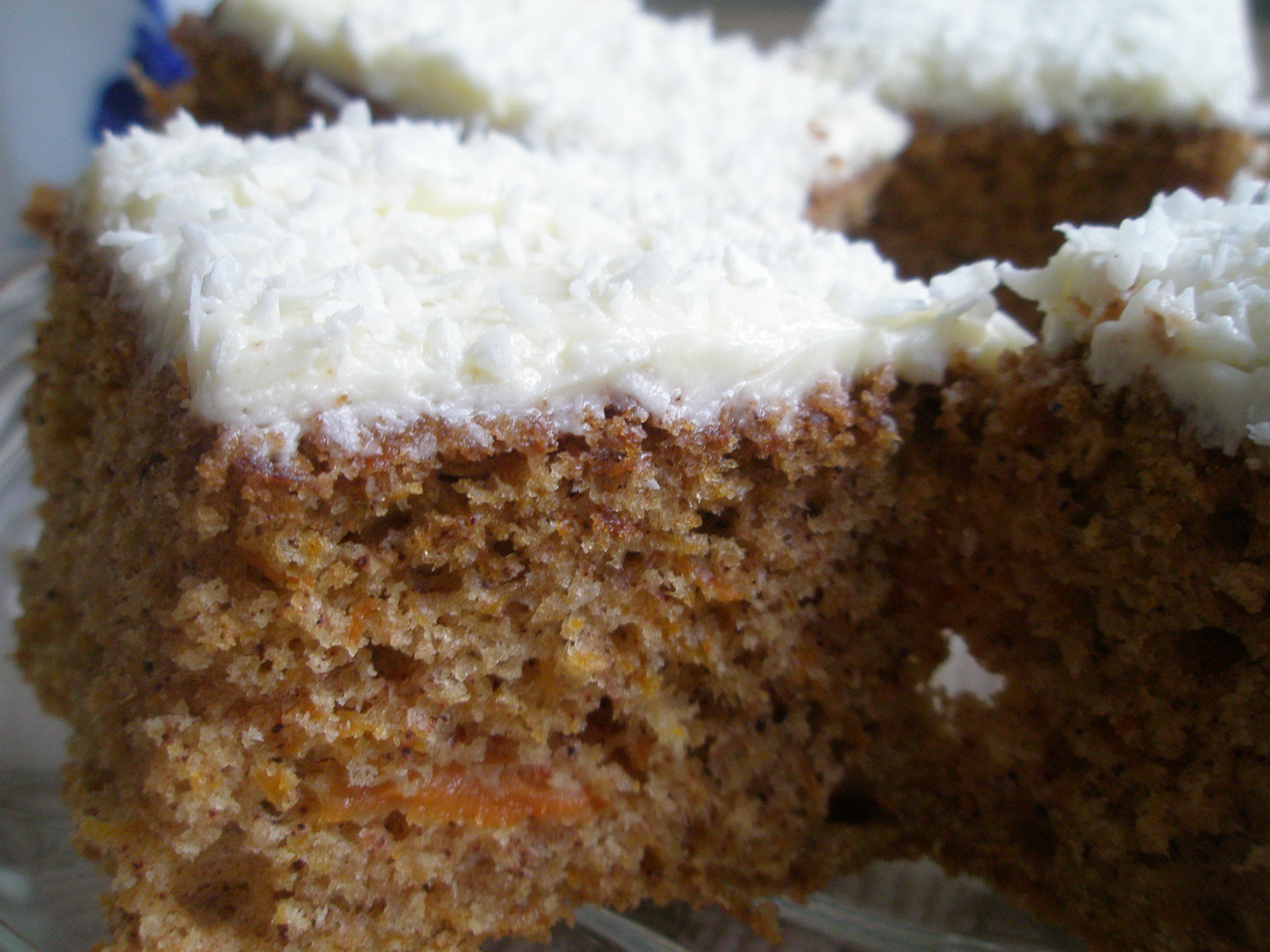 Vispa ägg och socker pösigt och vitt. Blanda ner oljan och de rivna morötterna och rör om ordentligt. Blanda mjölet med vaniljsocker och övriga kryddor samt bikarbonat och bakpulver. Blanda ner det i äggsmeten. Rör om lite så att det hela blandas och häll sedan smeten i smord eller bakpappersklädd långpanna. Grädda i mitten av ugnen på 200 grader i ca en halvtimme.