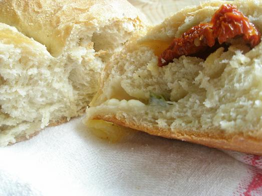 Vält upp degen på mjölat bakbord. Knåda den smidig och dela den i två delar. Kavla varje deg till en rektangulär platta omkring ½-1 cm tjock. Fördela soltorkade tomater och smulad mozarella samt örtkryddor (basilika, oregano, timjan eller kanske persilja). Rulla ihop degen och forma till en snäcka.
