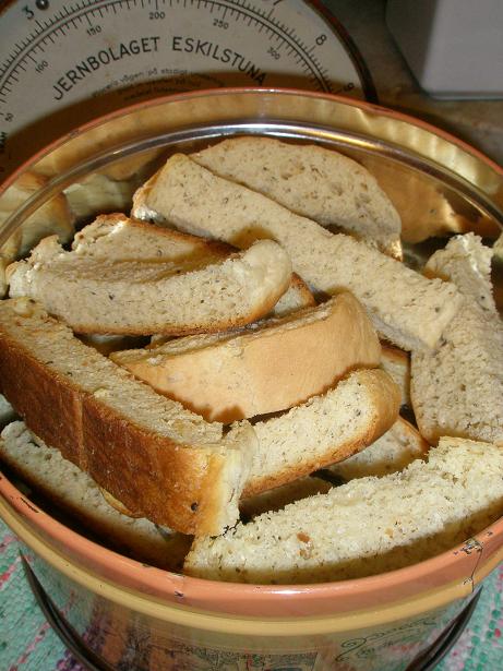Låt vetelängderna svalna och skär dem i skivor. Dela varje skiva i två delar (på tvären) och lägg på plåt. Torka i ugnen på 100 grader, eller så lågt ner du kan komma, tills de blivit torra och hårda. Låt kallna utan bakduk och förvara dem sedan i burk med lock! Underbart till frukostteet eller som mellanmål med lite ost eller marmelad!