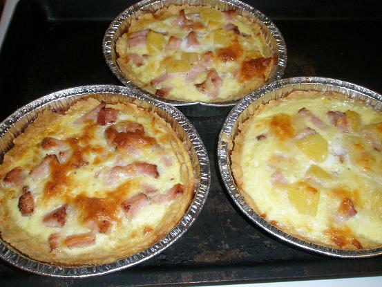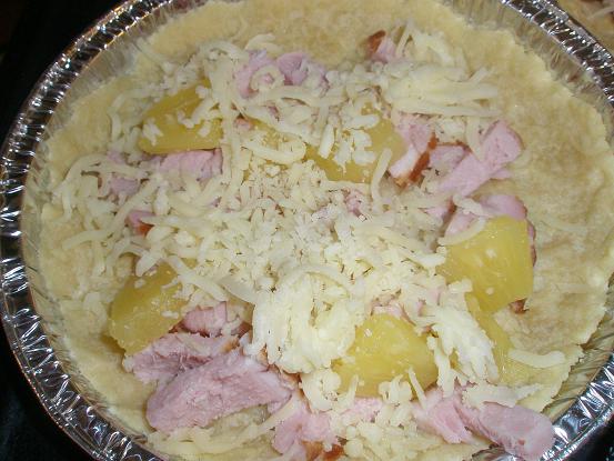 Fördela i pajskalen 2-3 hg rökt skinka, avrunnen ananas i bitar från 2 små burkar eller en stor samt 4-5 dl riven ostav valfri sort (gärna lagrad!).