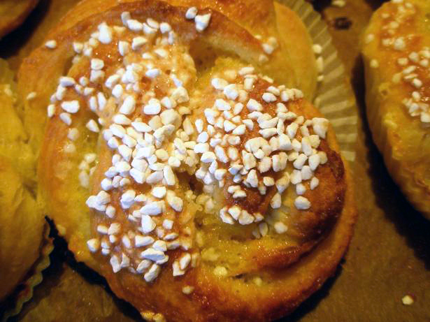 Låt bullarna jäsa på plåt i ca en halvtimme. Pensla sen med uppvispat ägg och strö över pärlsocker eller hackad mandel. Grädda mitt i ugnen i 8-10 minuter eller tills bullarna fått fin färg.