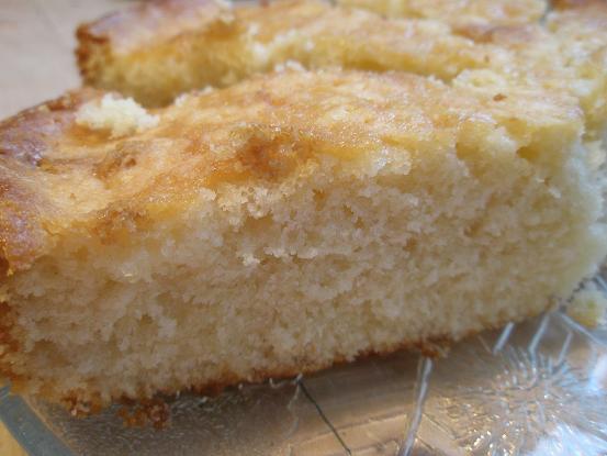 Vispa 1 ägg och 3 dl socker pösigt. Smält 150 smör eller margarin och låt svalna. Blanda 1½ dl mjölk i fettet och häll blandningen i äggsmeten. Rör ihop 3 dl vetemjöl med 1 tsk bakpulver och 1 msk vaniljsocker. Häll sist i 5-6 droppar bittermandelessens eller 20 skållade och rivna sötmandlar och 4 skållade och rivna bittermandel. Grädda i smord form (ca 2 l) i ca 175 grader näst längst ner i ugnen i omkring 50-55 minuter.