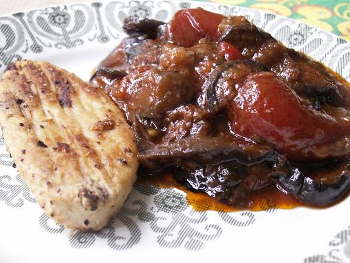 Fräs den krossade vitlöken i lite olja. Tillsätt tomaterna, socker, vinäger och vatten samt tomatpuré. Låt puttra i ca 15 minuter och krydda med salt och peppar. Lägg sedan i aubergineskivorna och låt puttra på svag värme i ytterligare 15-20 minuter. Toppa med persilja och servera till kött, fisk eller stekt quornfilé.