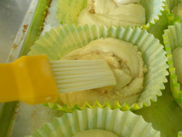 Låt bullarna jäsa på plåt i ca en halvtimme. Pensla sen med uppvispat ägg och strö över hackad mandel. Grädda mitt i ugnen i 8-10 minuter eller tills bullarna fått fin färg.