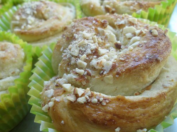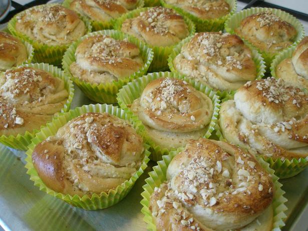Vält ut den jästa degen på bakbord och knåda den smidig. Dela degen i två delar och kavla ut varje deg till en avlång platta, ungefär ½ cm tjock. Bred på margarin och strö över socker och hackad mandel och baka ut till bullar.