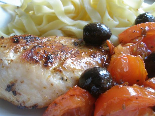 Idag visar termometern över 20 grader i skuggan och dagen är som gjord för en lätt lunch som går snabbt och som smakar fräscht. Jag föreslår stekt kycklingfilé med tagliatelle och en röra på färska tomater och svarta oliver. Lättare kan det inte bli – och det är supergott!