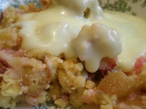 Blanda ingredienserna till smuldegen i en skål eller matberedare – nyp ihop (eller kör i matberedaren) till en smulig massa. Täck rabarbern med smuldegen och grädda i ugnen tills den fått guldbrun färg och rabarbern blivit mjuk – ca 25-30 minuter. Servera med halvsmält vaniljglass, vaniljsås eller vispad grädde.