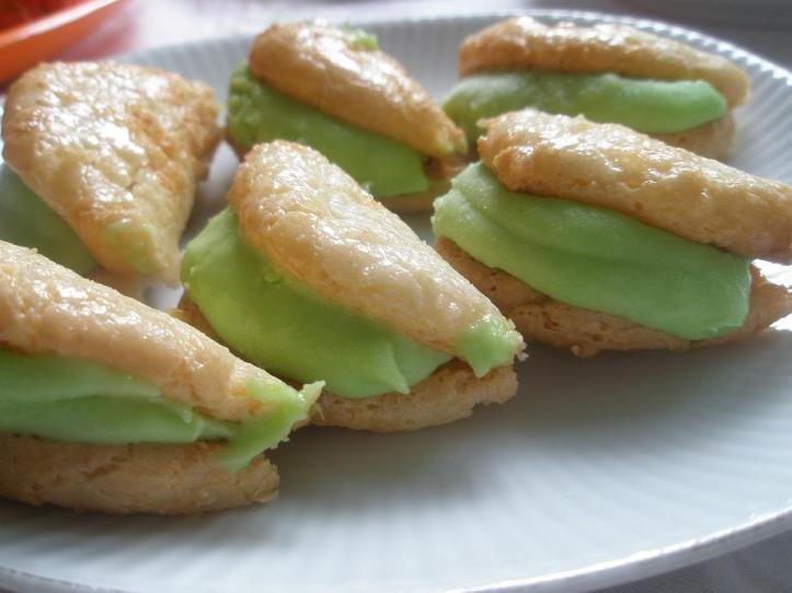 Vispa samman äggvitorna och sockret försiktigt. Blanda i mandelmassan och päronessensen. Klicka ut smeten på smord eller bakpappersklädd plåt – det blir ca 30-35 biskvier. Låt torka ett tag och grädda i 175 grader ca 5-10 min. Låt svalna innan du brer på smörkrämen.
