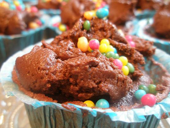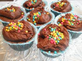 Vispa smöret mjukt med en elvisp och tillsätt mjölk och vaniljsocker. Sikta i florsockret, lite i taget och blanda ordentligt. Sikta sedan i kakaon och rör tills glasyren blir krämig och jämn. Spritsa eller bred glasyren på ”koppkakorna” och garnera med strössel, nötter, kokos eller bär.