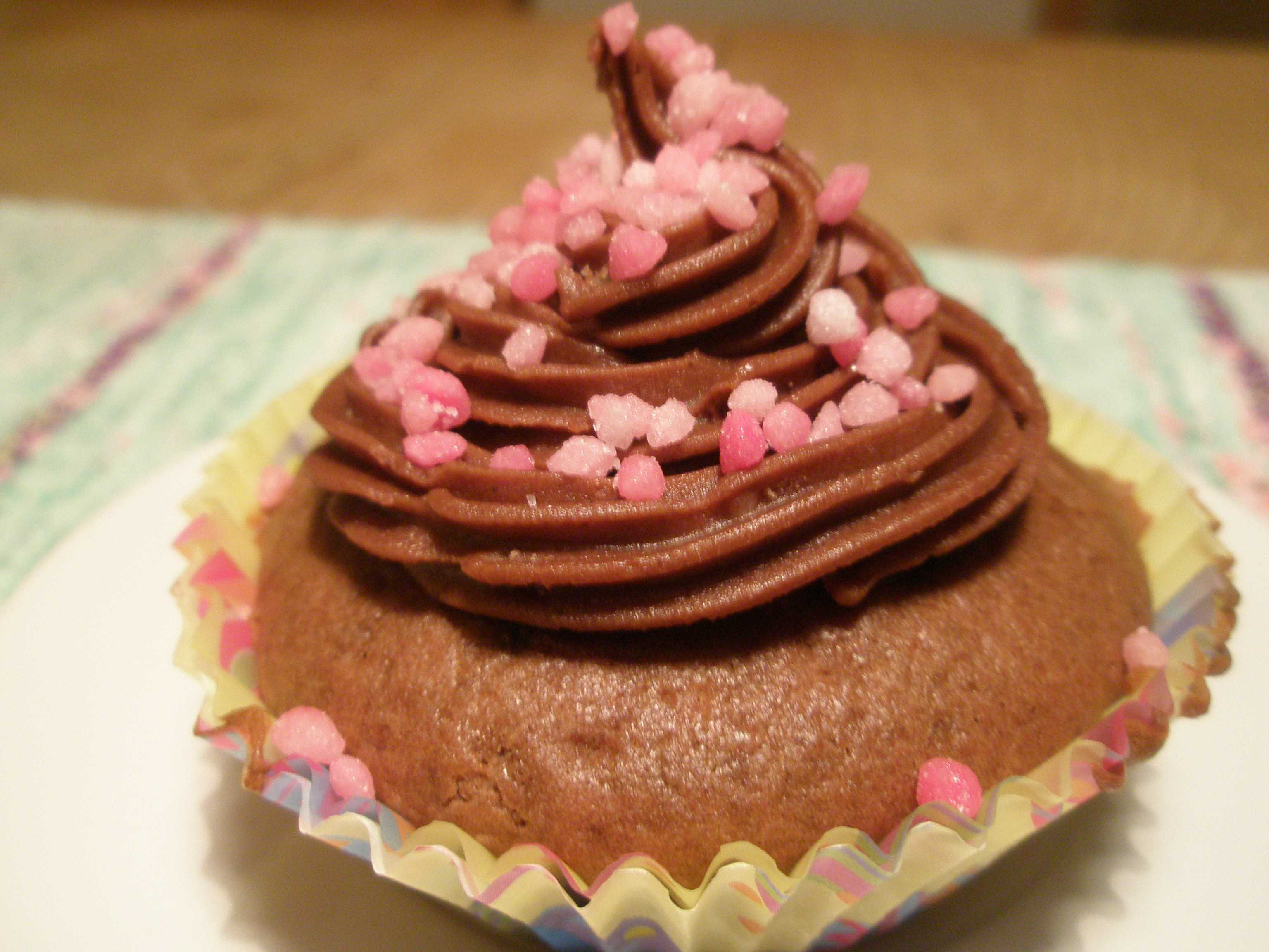 Vispa färskosten med sötningsmedel och kakao till en fluffig smet. Rör ner grädden och vispa lite till. Bred eller spritsa på muffinsarna. Garnera med valfri topping, t ex strössel eller kokos.