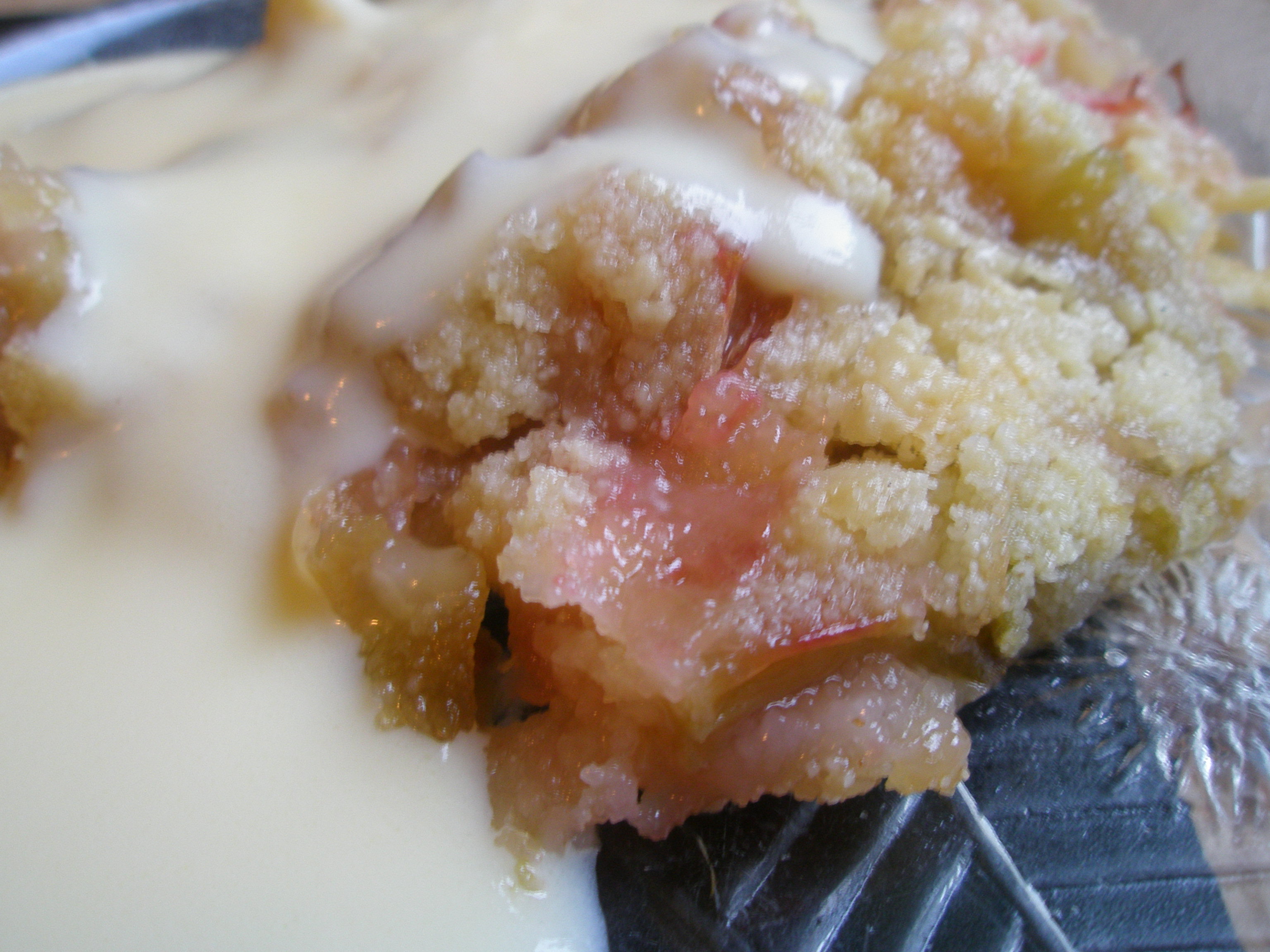 Fördela 1 dl socker, 1 dl vetemjöl och 1 dl mannagryn över rabarbern. Det är viktigt att strö över i just denna ordning. Riv över 50 g vit choklad. Täck allt med 75 g smör hyvlat med osthyvel (OBS – smöret måste vara kylskåpskallt!). Grädda i 200 grader ca 20 minuter.