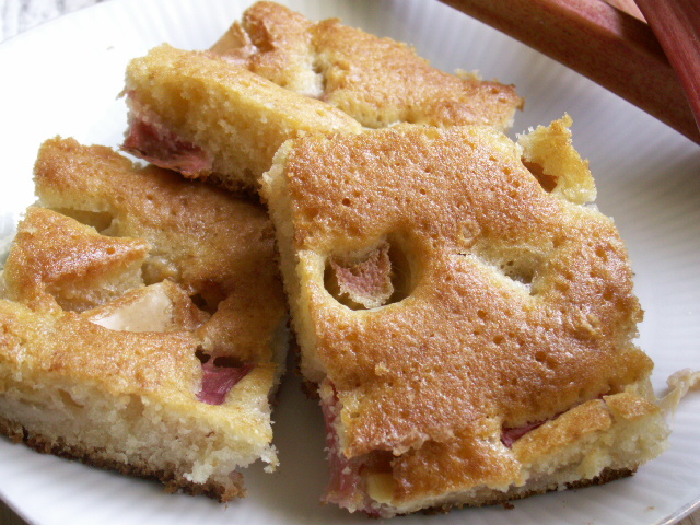 Smält smöret. Vispa ägg och socker poröst. Häll i smöret samt mjölken och rör om. Tillsätt mjölet blandat med bakpulver och rör tills allt är ordentligt blandat. Häll i smord ugnsform, ca 30×30 cm, och strö över rabarber och den rivna chokladen (eller chokladbitar). Grädda i mitten av ugnen i ca 30 minuter.