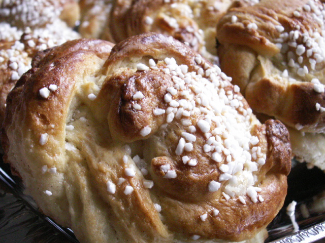 Låt bullarna jäsa på plåt i ca en halvtimme. Pensla sen med uppvispat ägg och strö över pärlsocker. Grädda mitt i ugnen i 8-10 minuter eller tills bullarna fått fin färg.