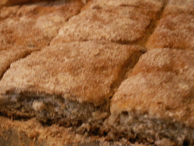 Jag arbetade degen smidig, lät den jäsa till dubbel storlek under bakduk – det tog en dryg timme på grund av den mindre jästmängden. I med bakplåtspapper i en långpanna, och sen i med degen – bara att välta i och platta ut. Sen skårade jag brödkakan i lagom stora bitar och strödde lite grahamsmjöl över och lät jäsa på plåten medan ugnen blev varm (225 grader) – det tog ca 20 minuter.