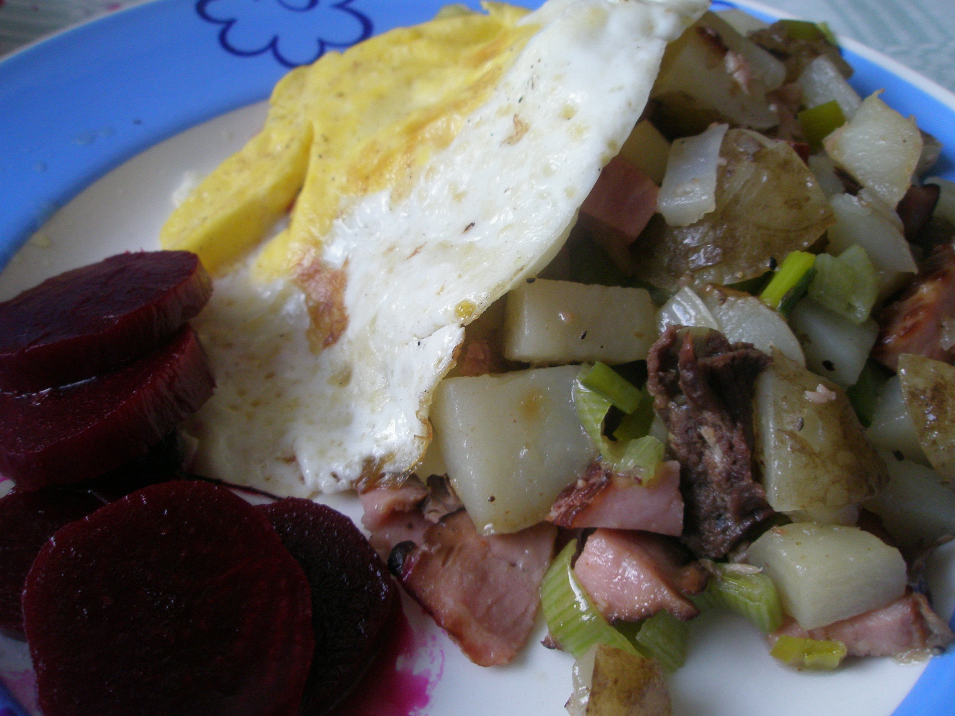 Pyttipanna kan du förstås göra på en massa olika sätt. Med tärnad potatis som du råsteker – eller med överbliven kokt potatis från gårdagens middag, som du skär i mindre bitar och steker upp. I med lite strimlad purjo eller hackad lök (eller båda delar!) och lite korv- och köttrester och du har en riktigt god middag för en blygsam penning. Om din butik säljer ojämna skivor av korv och andra pålägg billigt kan du fynda och lägga i frysen – dessa är perfekta att använda i pyttipanna! Stek ett ägg till och servera med de goda rödbetorna och du håller dig mätt länge!