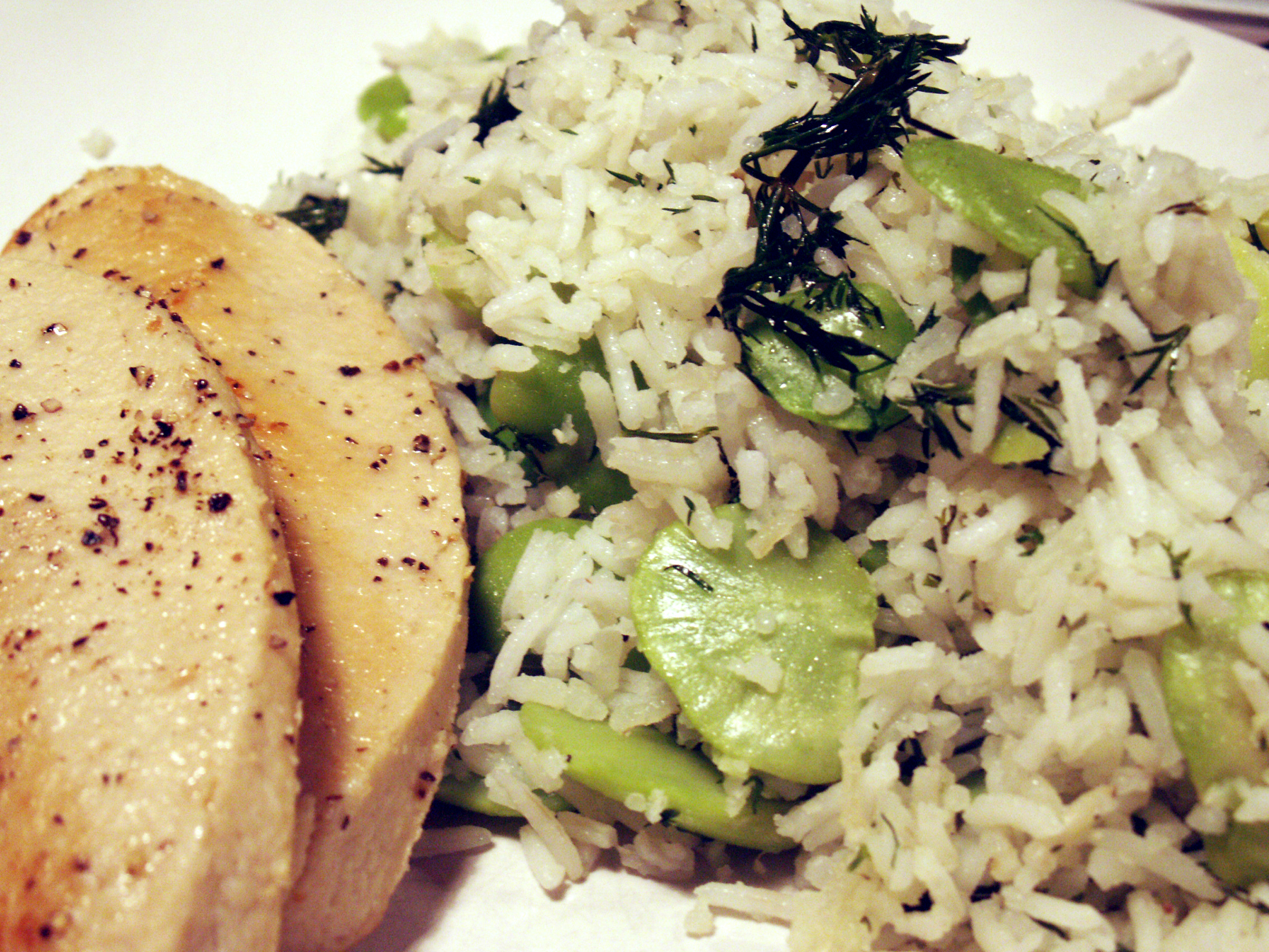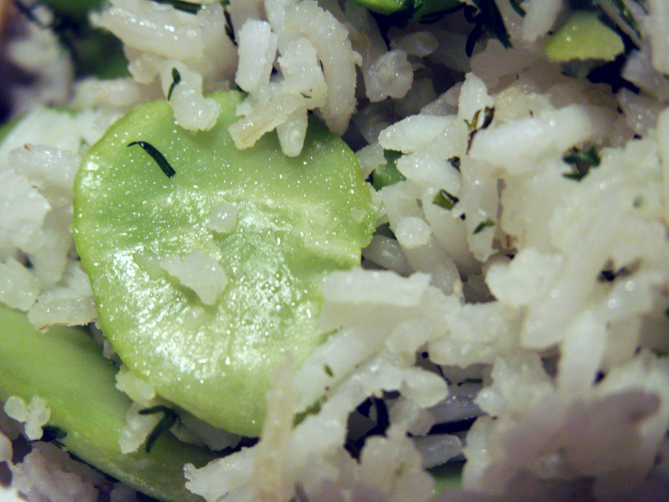 Gör så här: Lägg riset i blöt i vatten i ca 30 minuter. Koka sedan upp vattnet, skölj riset och häll i det i det kokande vattnet. Koka på hög värme i 5 minuter och häll sedan av riset i ett durkslag. Lägg smör i grytan, häll tillbaka riskornen samt bondbönor och dill. Låt puttra på mycket svag värme i ca 20 minuter, smaka av med salt och svartpeppar och servera som ensamrätt med tomater eller till stekt fisk.