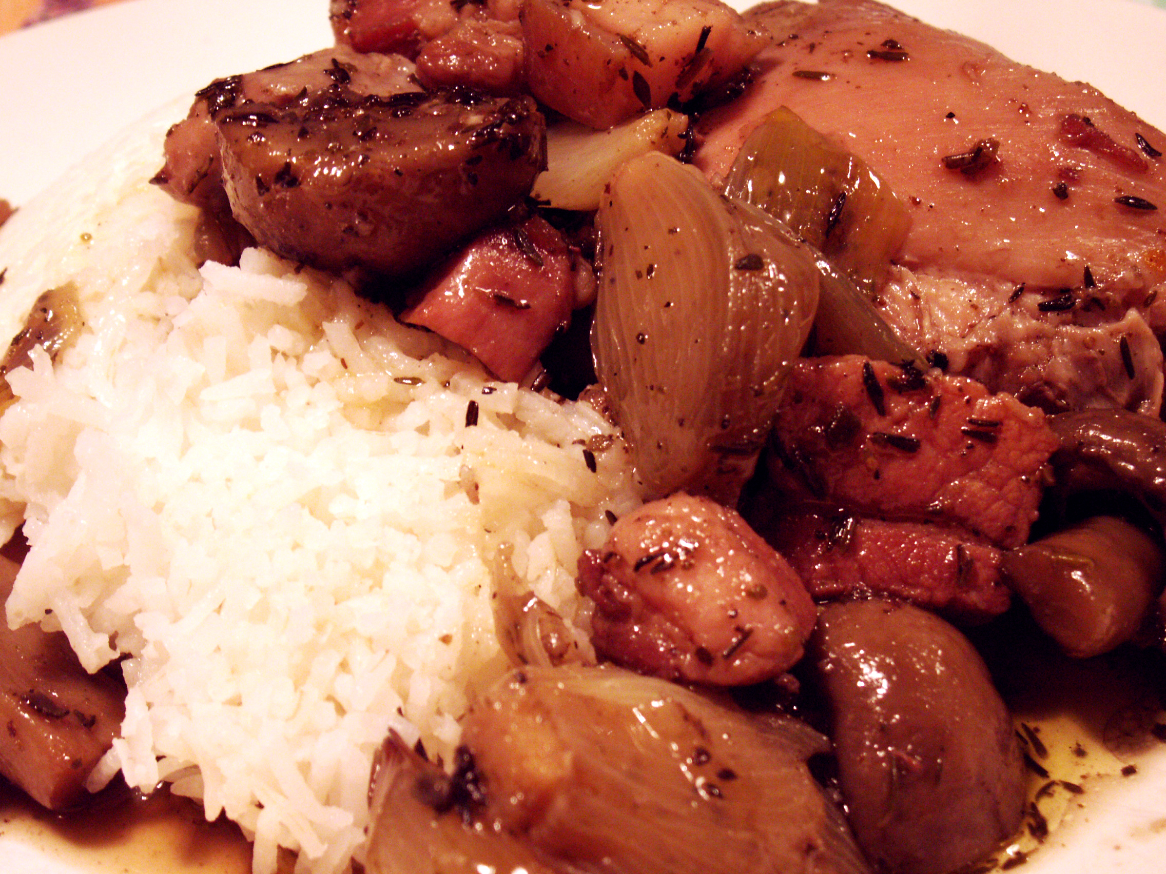 Gör så här: Fräs kycklingdelarna tillsammans med lite salvia, timjan och spiskummin i smör i en stor järngryta, eller liknande. Skala löken och halvera eller kvarta champinjonerna. Tillsätt detta till kycklingen, lägg i lagerblad och smula i buljongtärningar samt häll i vatten och vin. Låt puttra på svag värme minst 1 timme, gärna ännu längre – rör om någon gång emellanåt och krydda gärna med mer spiskummin och örtkryddor. Servera med buljongkokta matkorn eller ett gott ris.