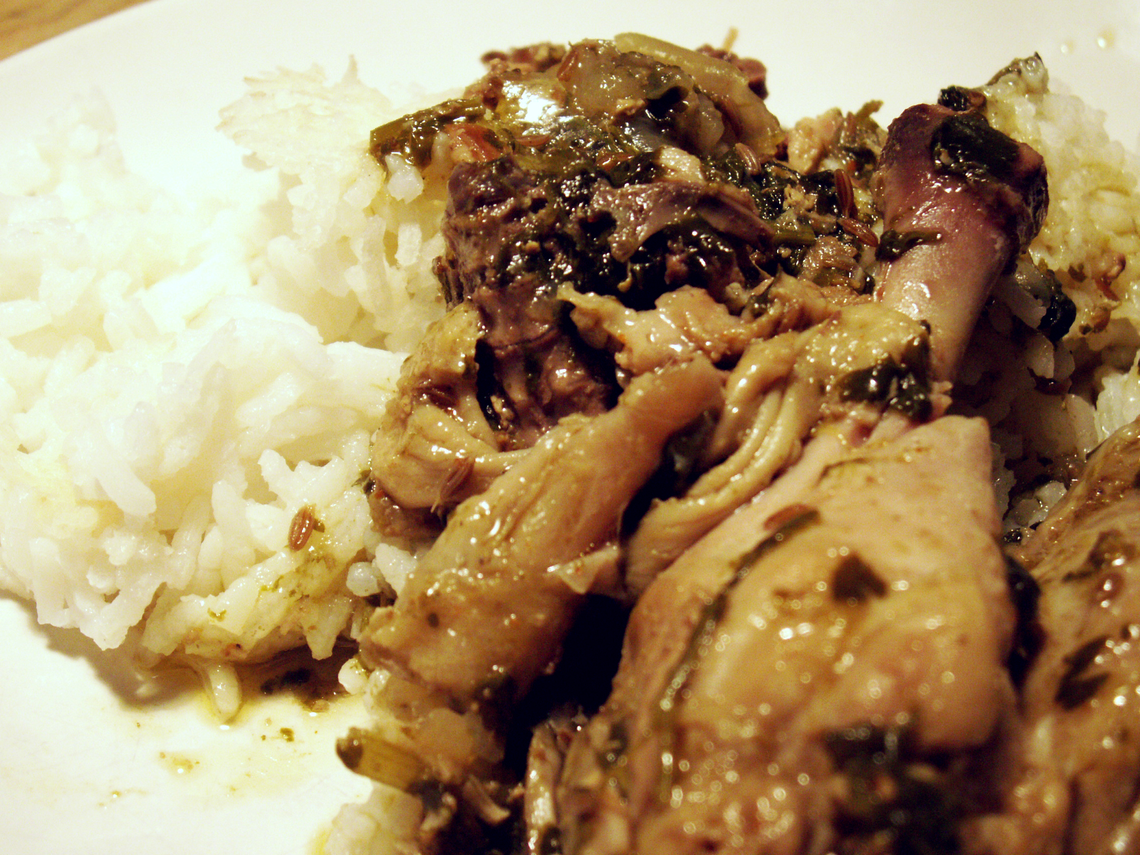 Gör så här: Dela kycklingen eller hönsen i portionsbitar och fräs på medelstark värme i olivolja. Låt även spiskummin och chili fräsa med. Efter några minuter tillsätter du även löken. Fräs tills löken blivit gneomskinlig och kycklingen fått färg, och smula sedan buljongtärning. Fyll på 2-3 dl vatten samt finklippt koriander och persilja. Låt koka minst en timme, gärna längre, och smaka av med salt och peppar. Servera med ris.