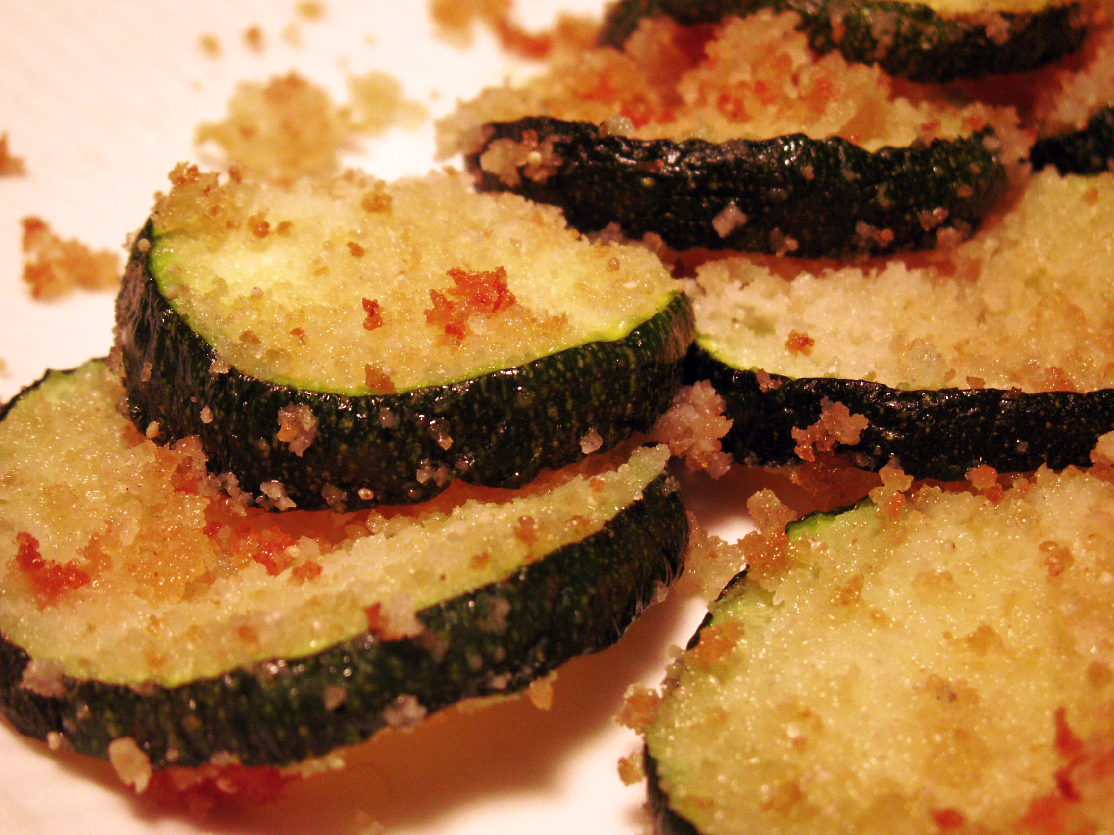Ibland är det bra att ha ett tomt skafferi och en kyl som behöver fyllas på – det kan skapa en viss kreativitet i köket. Som häromdagen, när vi var sugna på något gott och det knappt fanns nåt annat än knäckebröd och kaffe. Men i svalen fanns ett par zucchinis som såg hyfsat fräscha ut, och i skafferiet fanns både vetemjöl, ströbröd och olivolja. Resultatet? Skivad panerad zucchini, stekt i olja med salt och peppar och chilikrydda – och plötsligt hade vi ett fat med jättegoda snacks!