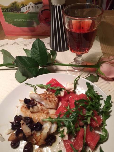 Servera torsken med en sallad på fetaost, ruccola och vattenmelon och ett glas Drostdy-Hof. Festligt och fräscht!