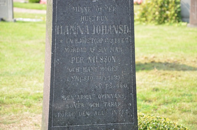 Idag har jag rest i en mördares fotspår. En resa till Österlen tog mig först till Brösarp, till en grav med en inskription som berättar om ett av de mest uppmärksammade – och tragiska – mordfallen i svensk historia. Därefter gick färden vidare till den plats där mördaren – den av dem som undgick dödsstraffet och blev en fri man på sin ålders höst – framlevde sina sista dagar i tysthet och, får man anta, ånger och ångest över det dåd han en gång begick. Jag talar naturligtvis om Yngsjömordet, det som begick i mars 1889 av Anna Månsdotter och hennes son Per Nilsson då de båda tillsammans mördade Pers unga hustru Hanna Johansdotter.