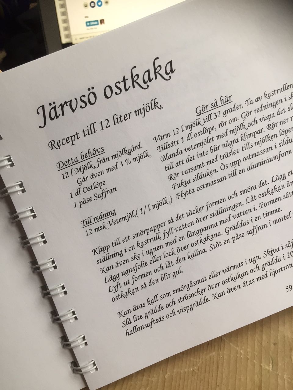 Denna ostkaka ingår förstås i boken Järvsö – mattraditioner från en bygd, som tillkommit på initiativ av Magnus Hedin ICA och SPF Seniorerna Järvsö för att stimulera den unga generationen att ta upp de gamla mattraditionerna och laga maten från grunden. En helt fantastisk bok med underbara och värdefulla mattraditioner som är väl värda att återuppta och som gör sig alldeles utmärkt i dagens klimat- och miljömedvetna samhälle.
