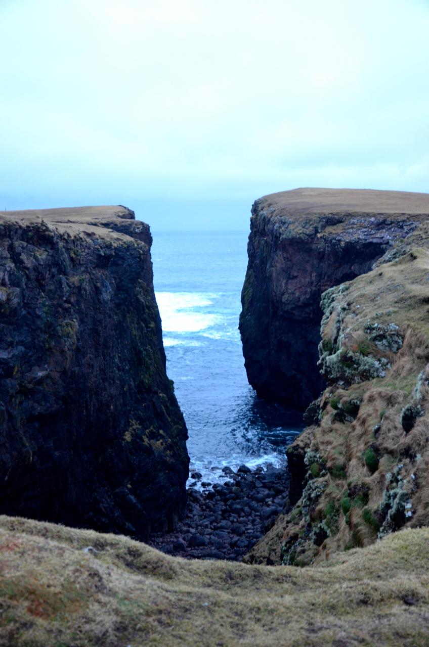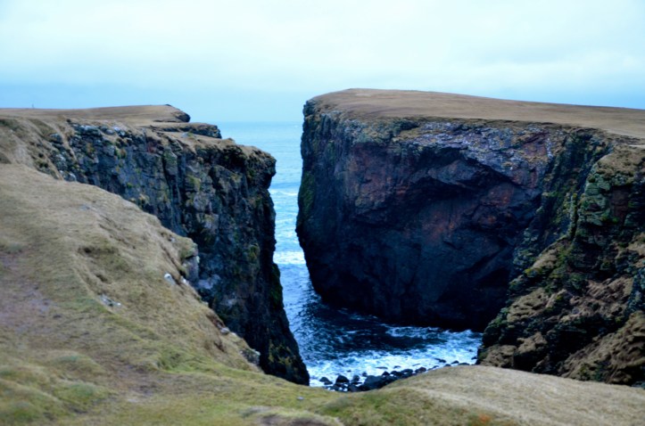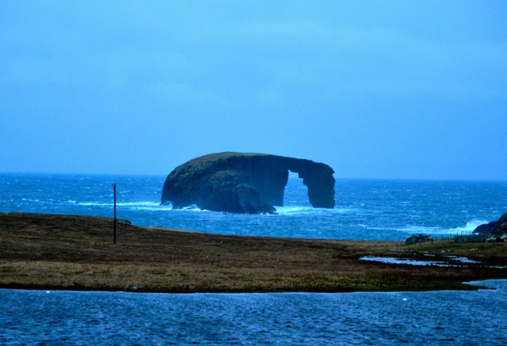 Vad säger man om detta? De vulkaniska klipporna i Eshaness på Mainlands norra udde – även här möts Nordsjön och Atlanten och det som vi stockholmare skulle kalla storm är bara en mild bris för Shetlandsborna…