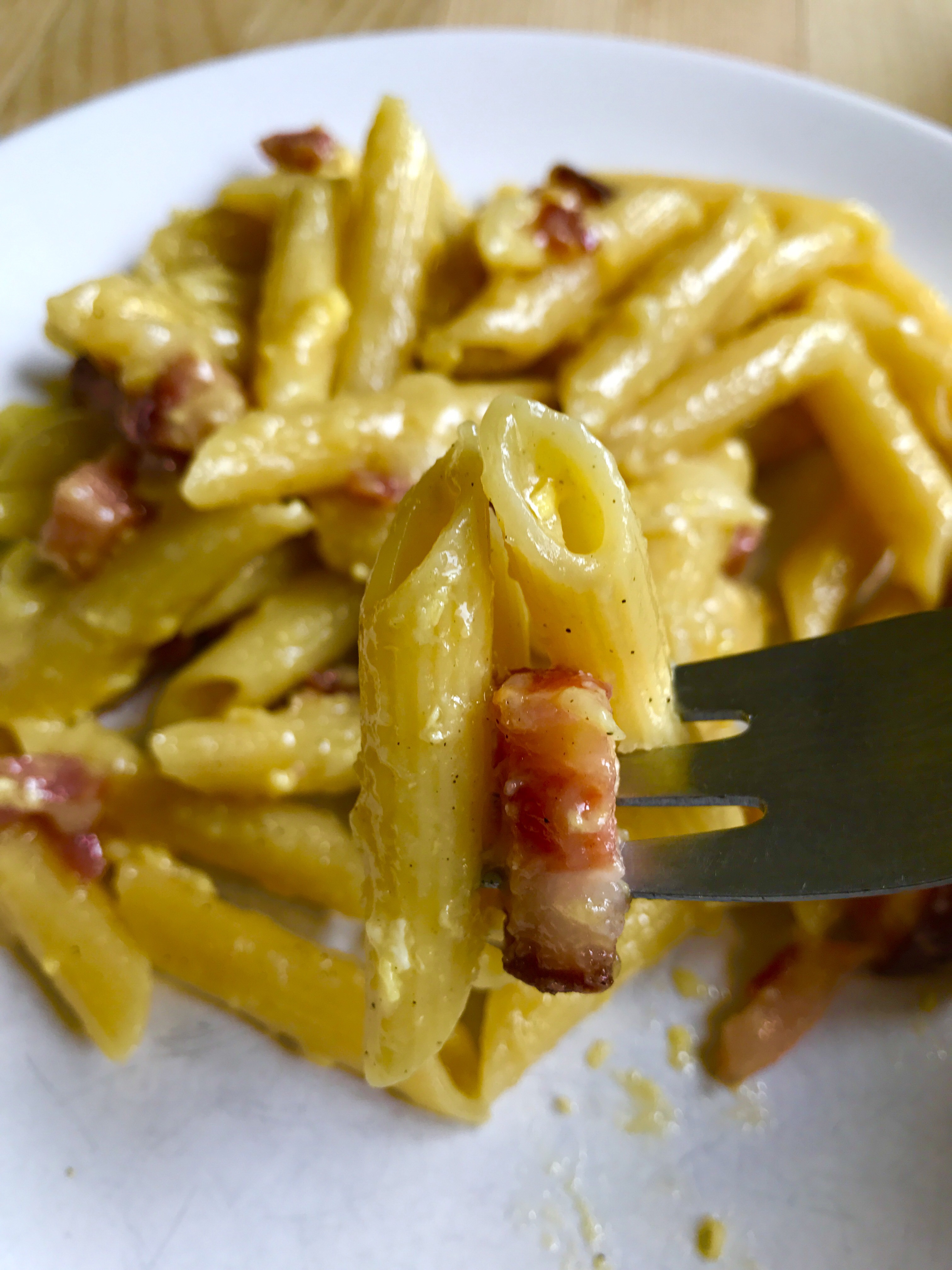 Koka under tiden ca 400 g kort pasta al dente (och dra gärna av ett par minuter på koktiden som står angiven på förpackningen). Vispa upp 3 ägg och rör ner i den heta pastan. Häll i fläsket och peppra över generöst med svartpeppar. Servera med riven eller tunt hyvlad parmesan.