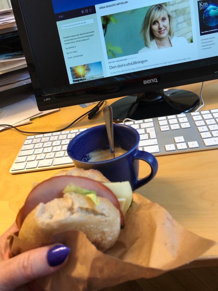 … i dubbel bemärkelse. Macka och latte framför datorn.