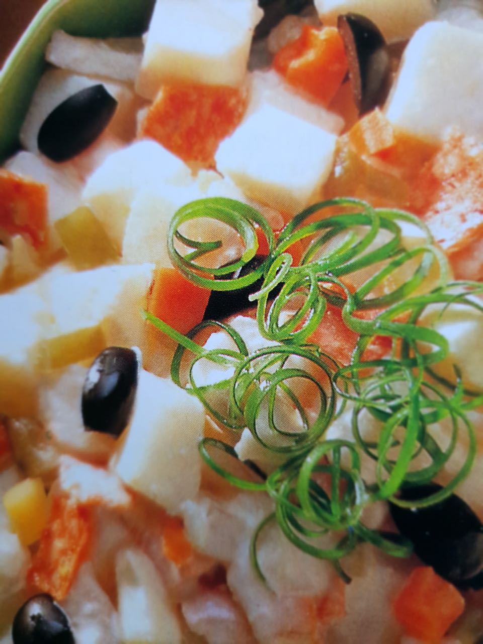 Gör så här: Koka potatisen till den precis är mjuk (den får inte koka sönder!). Låt den rinna av och häll den i en stor serveringsskål. Rör varsamt ner de övriga ingredienserna och salta och peppra. Dekorera gärna med några gröna purjolöksstrimlor. Servera den ljummen.