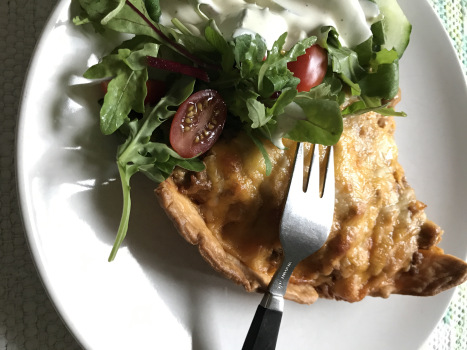 Smaka av med salt och peppar och fördela färsen i pajskalet. Strö över 2-3 dl riven ost, gärna cheddarost. Grädda mitt i ugnen i 200° ca 20-30 minuter. Servera med sallad!