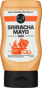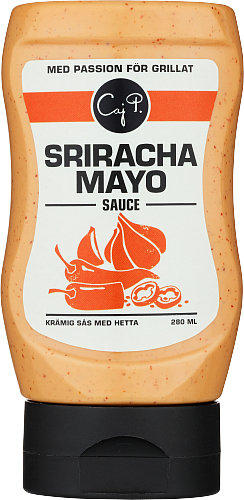 Caj P. Sriracha Mayo är en krämig chilisås av majonnäs-typ med tydlig hetta av het chili och vitlök. Krämig och god passar den till alla former av lax, kyckling och pokébowls – och givetvis som en het och smakrik hamburgerdressing.
