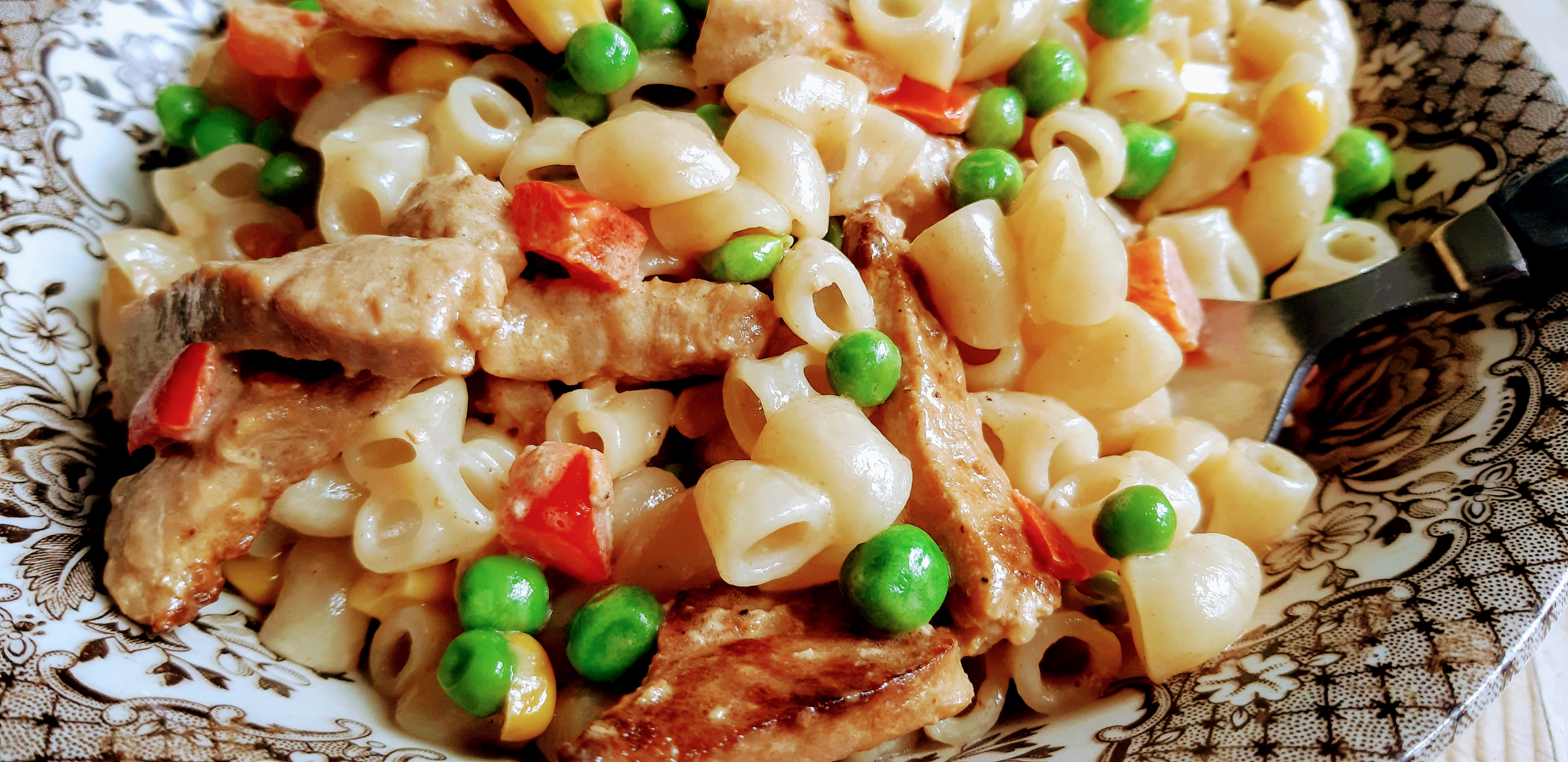 Den här rätten kom till när jag hittade en påse blandgrönsaker och en förpackning med skivad skinkstek, som legat lite väl länge i frysen. Den blev över förväntan god.