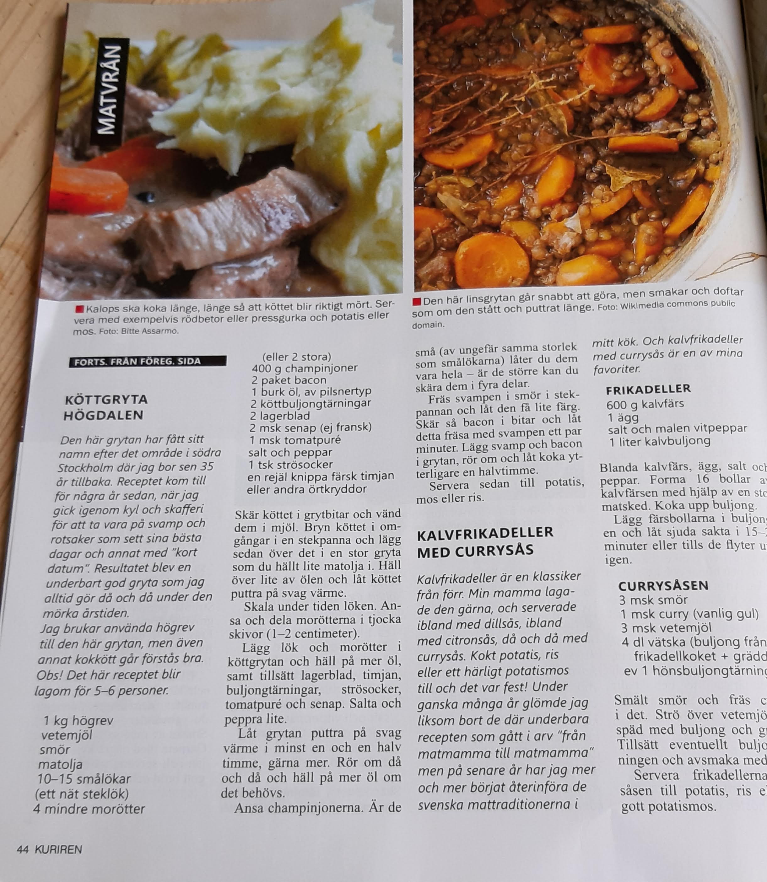 Idag damp finlandssvenska Kuriren ner i brevlådan. Där medverkar jag med matreportage regelbundet sen flera år tillbaka och just i detta nummer, när hösten står för dörren, skriver jag om långkok. Flera av recepten finns på bloggen – som Köttgryta Högdalen, Frikadeller med currysås och Kabsa.