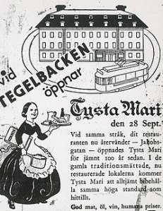 I början av 1930-talet flyttade Tysta Mari till Tegelbacken, där det låg kvar ända till 1954. Men då hade nutiden hunnit ikapp historien och rivningens hysteriska vindar blåste med orkanstyrka. Bort med de gamla kaféerna, där 1800-talets och det tidiga 1900-talets poeter och journalister avhandlade sina teser och funderingar över en kopp kaffe och en smörgås. Fram för jättelika parkeringshus, genomfartsleder och modern bebyggelse. Och Tysta Mari försvann in i tystnaden. I alla fall för en tid.