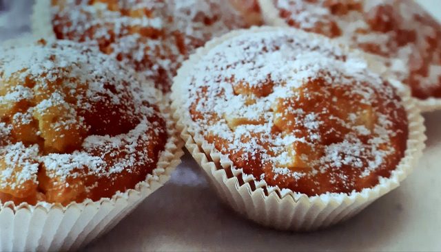 Fyll hälften av smeten i muffinsformar, lägg i äppelskivor och fördela sedan resten av smeten i formarna. Grädda på nedersta falsen ca 15-20 minuter. Pudra lite florsocker över dem när de har kallnat och avnjut med en kopp kaffe – eller varför inte med ett glas iskall mjölk.