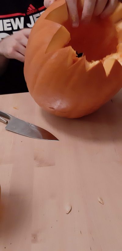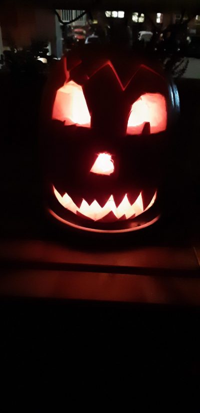 Därefter skar vi förstås ut vår egen Jack O’Lantern, och sen blev det skräckfilm, god mat och massor med godis till långt in på småtimmarna…
