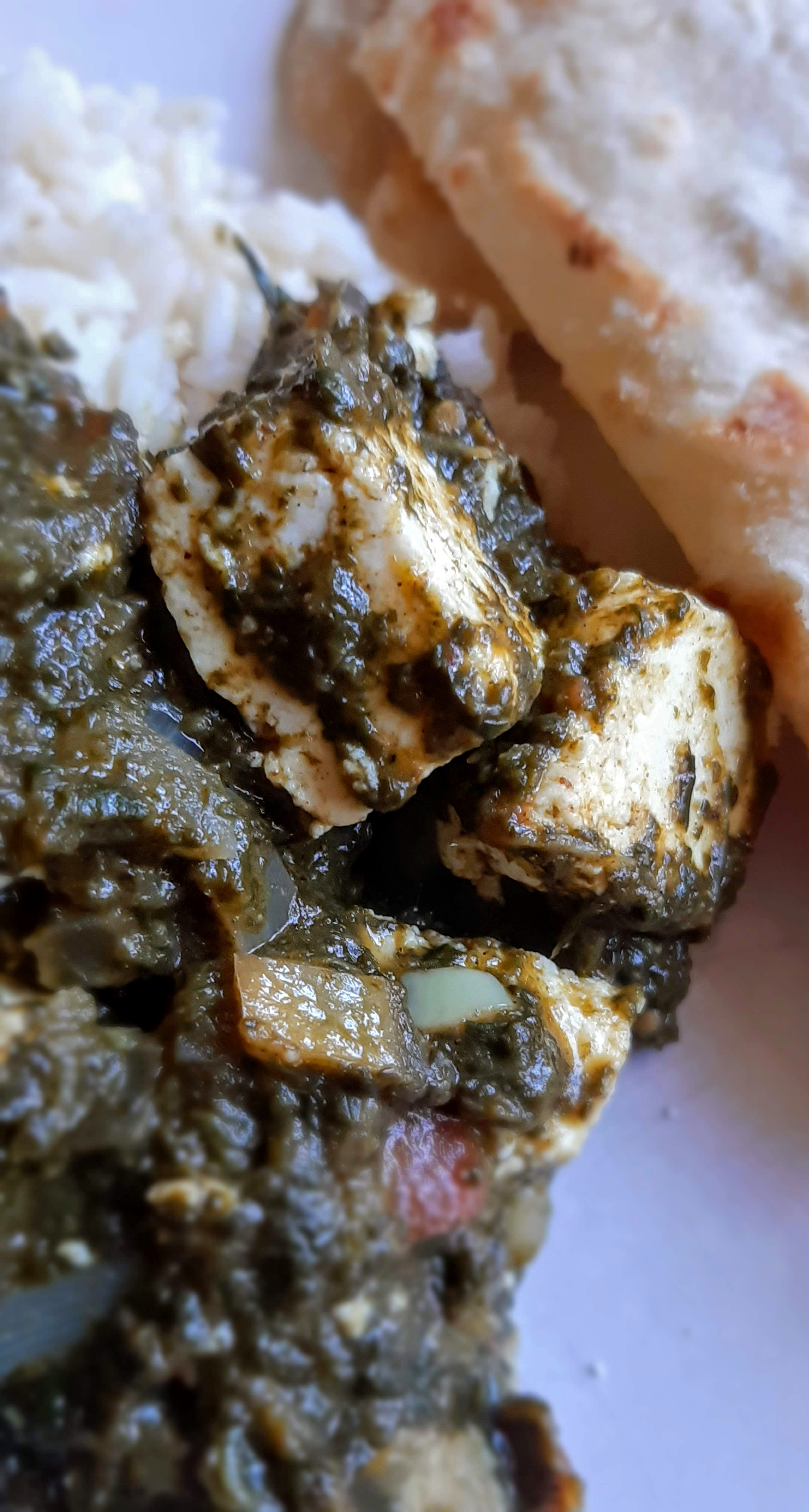 Skär paneer-osten i kuber. Fräs dem, om du vill i lite olja först – annars går det bra att vända ner dem direkt i spenaten. Låt puttra på svag värme i 3.4 minuter och servera sedan till ris och/eller chapati.