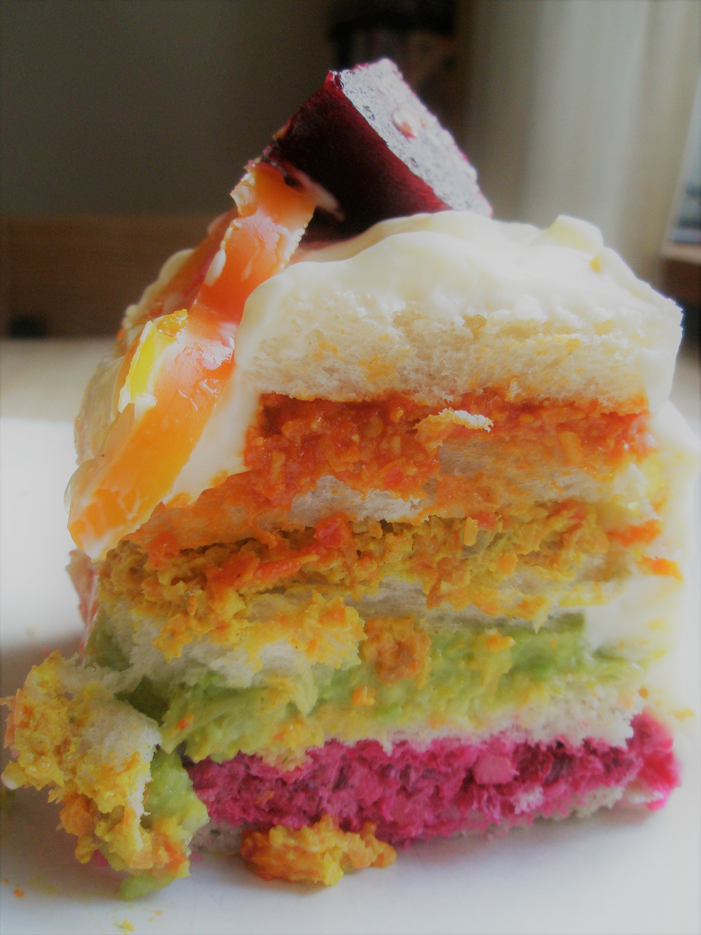 Blanda färskost och creme fraiche och smaksätt med curry, salt och peppar samt citron. Bred över hela tårtan, även kanterna, och garnera sedan med valfria frukter och grönsaker.